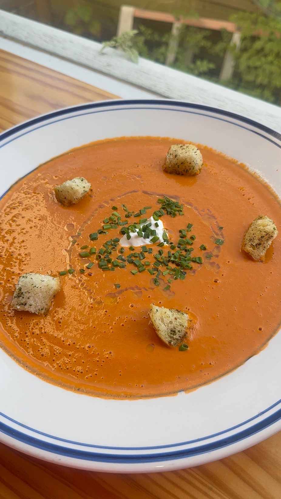 Tomato Basil Soup - $9 Cup / $15 Bowl | Creamy tomato basil soup served with croutons and topped with sour cream.