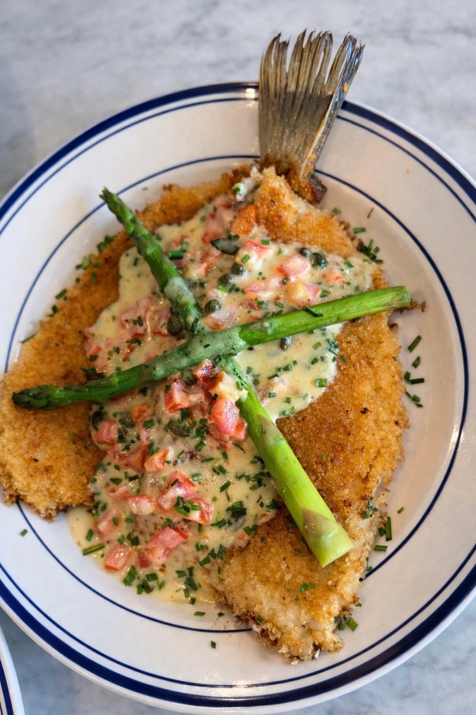 Butterflied Flounder served with mashed potato & asparagus.