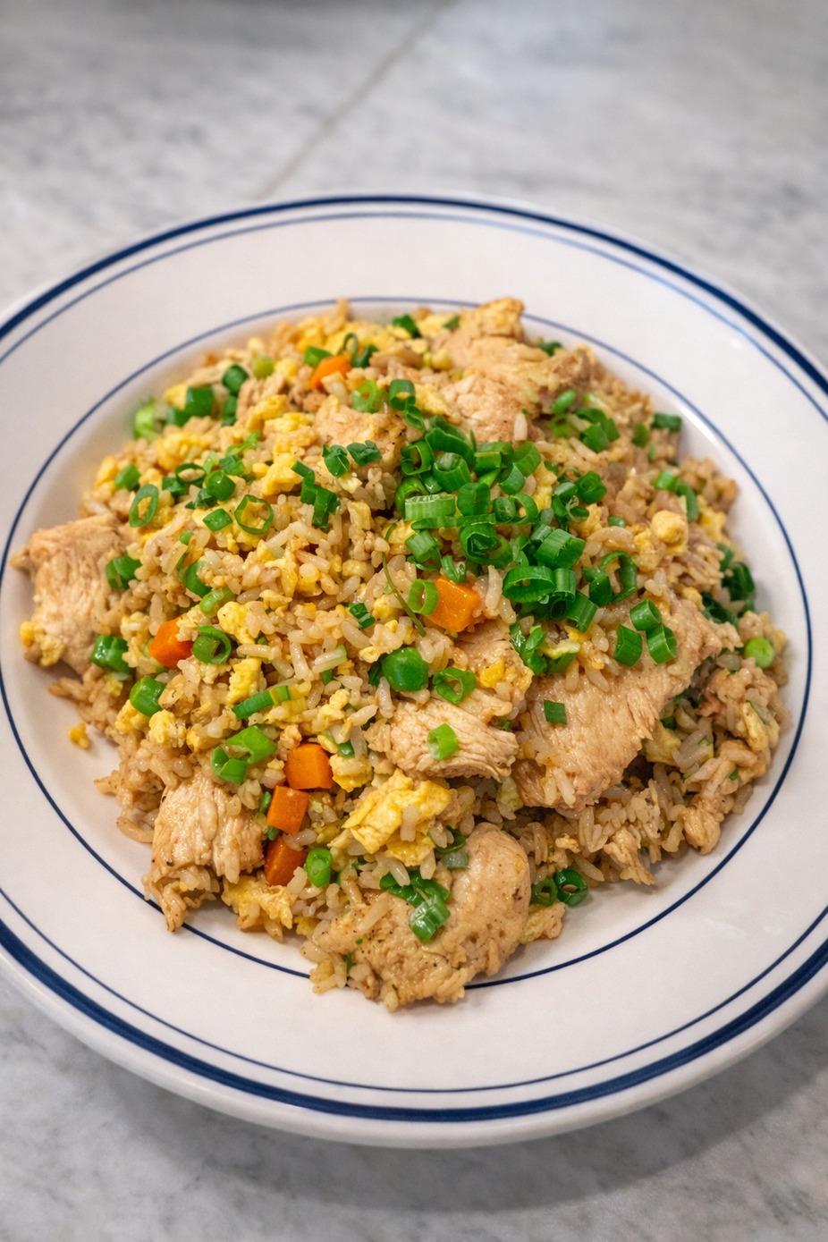Chicken Fried Rice - sliced chicken, carrots, peas, garlic & soy sauce. - $15