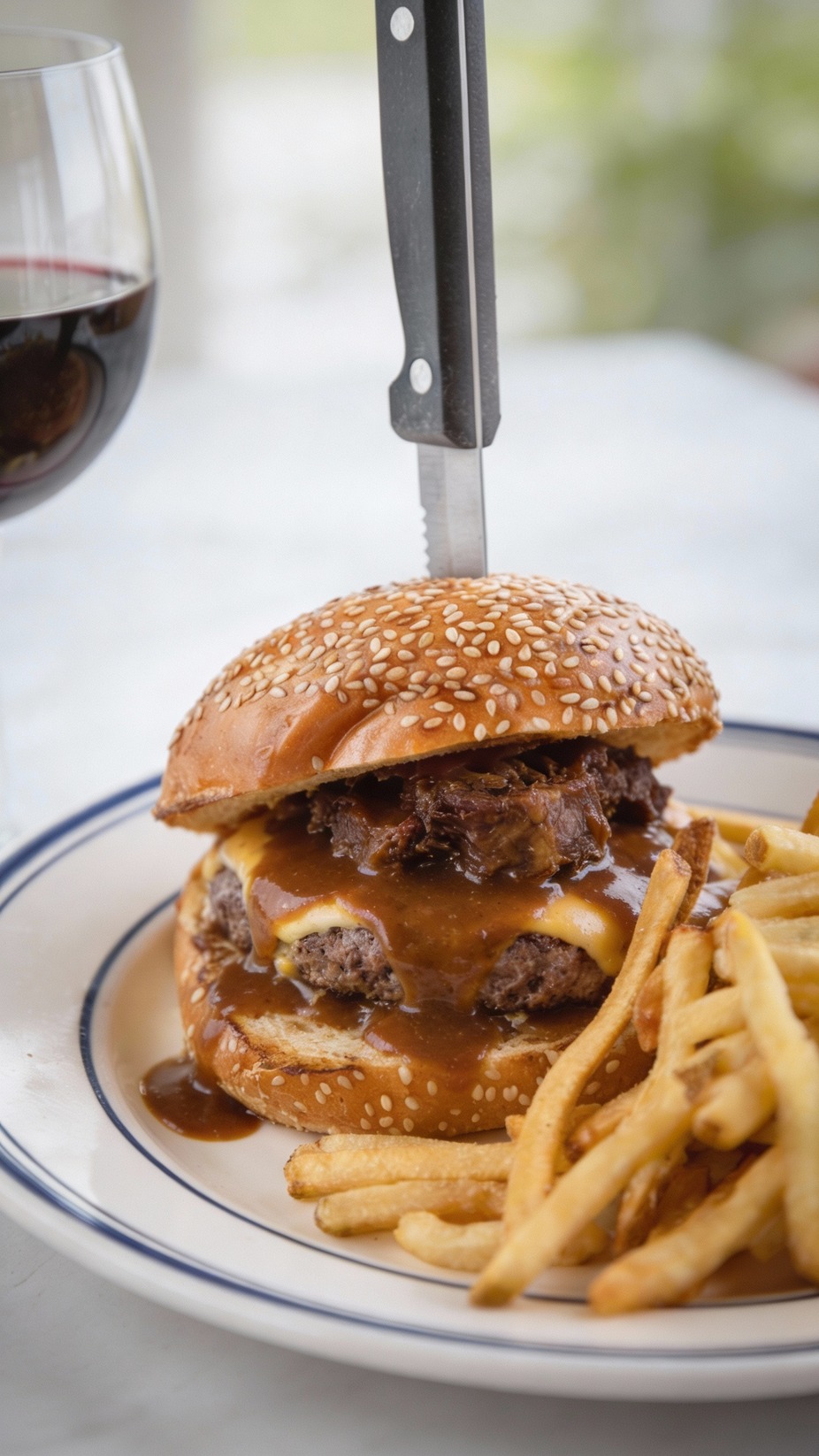 Butcher Burger- $20 | 8oz beef patty, American cheese, 4oz braised short rib & brown gravy. Served with steak fries.