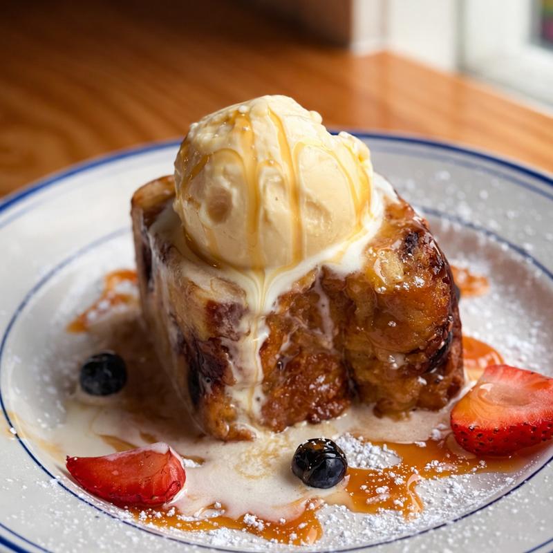 Warm brioche bread pudding filled with white chocolate & berries topped with vanilla ice cream, & caramel sauce.