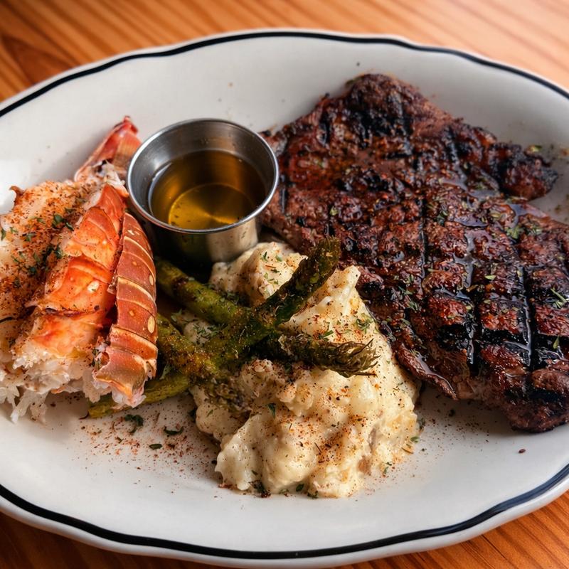 12oz Ribeye served with a Maine lobster tail, asparagus & mashed potatoes. (Get just the steak & sides for $28)