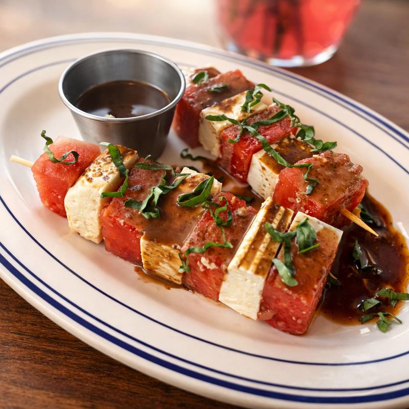 2 skewers garnished with mint and topped with balsamic vinaigrette