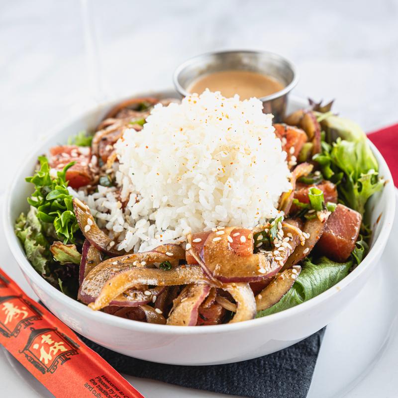 Hawaiian dish with white rice, burger patty, spam, pineapple, egg, brown mushroom gravy, jalapenos