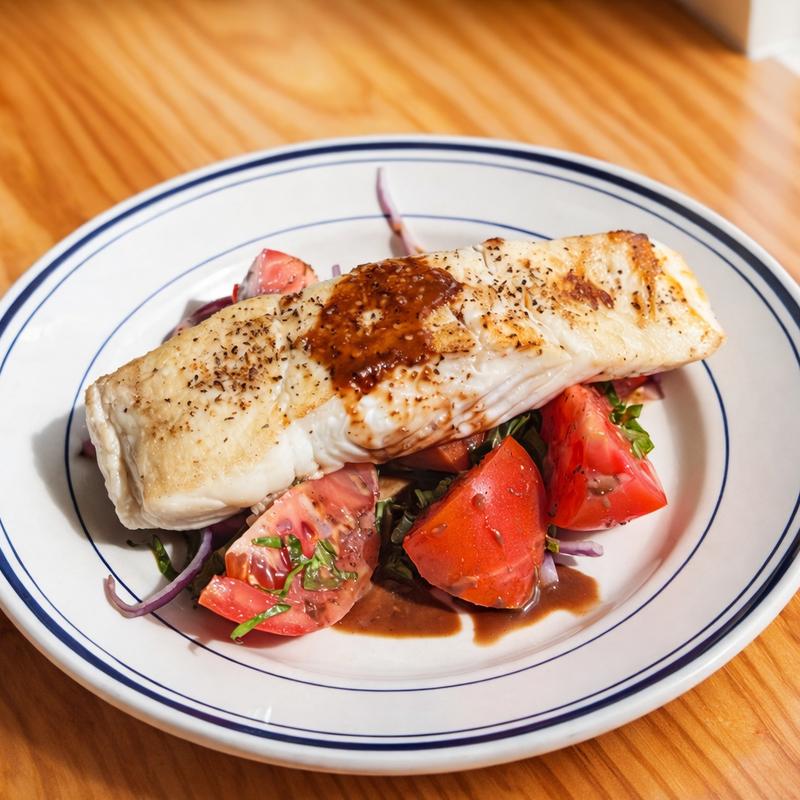 Crispy striped bass served with a heirloom tomato salad & topped with balsamic glaze.