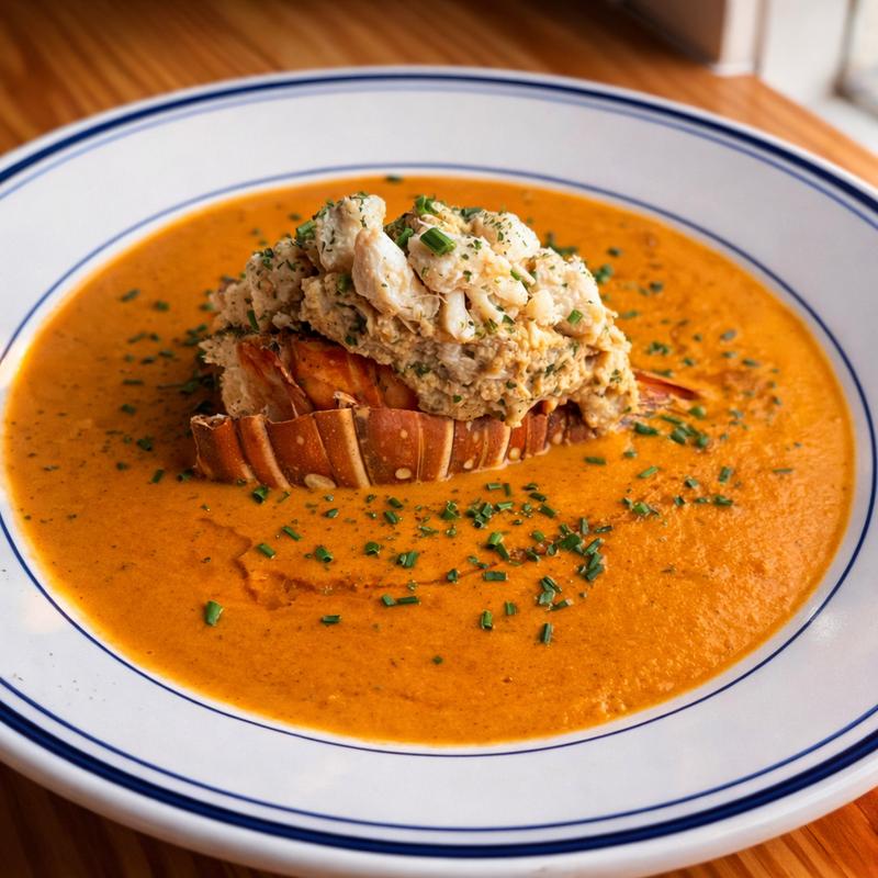 Bowl of our famous in house lobster bisque served with a lump crab stuffed Maine Lobster Tail.