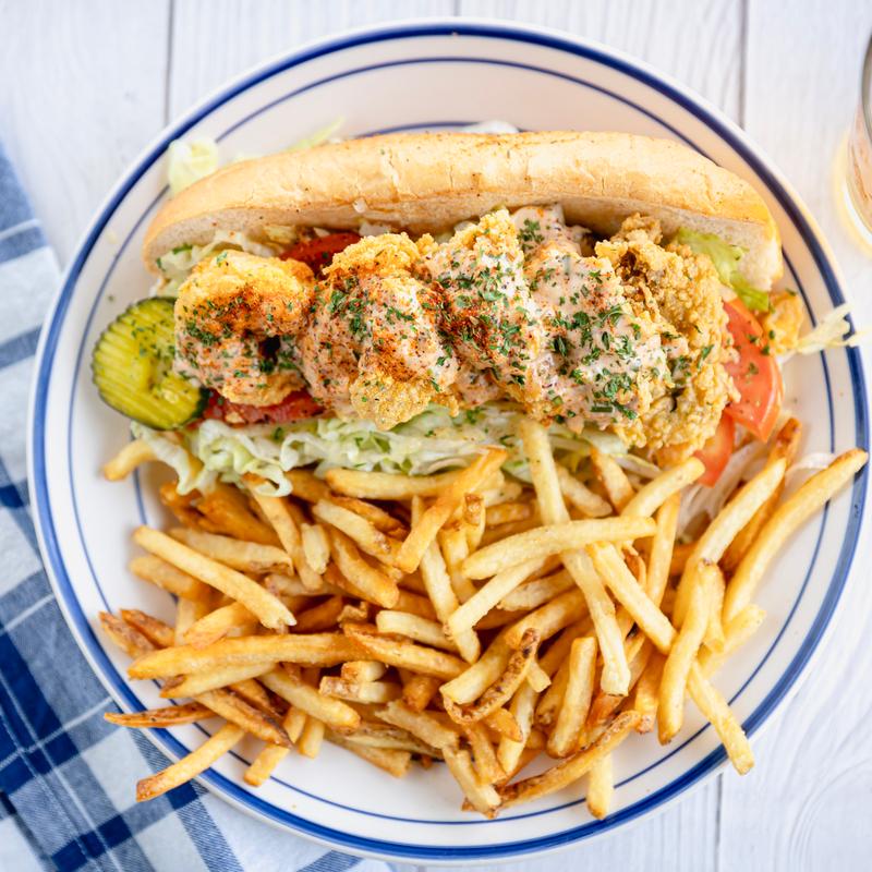 Shrimp, Oyster, or combo, dressed with remoulade, lettuce, tomato & pickle