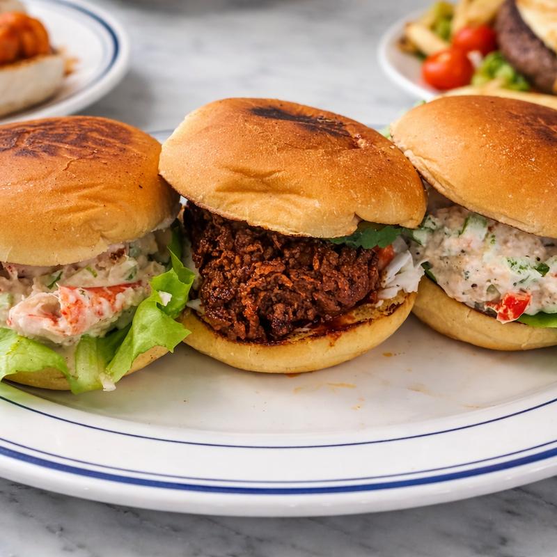 3 Sliders - Fish dip, lobster salad, and spicy chicken