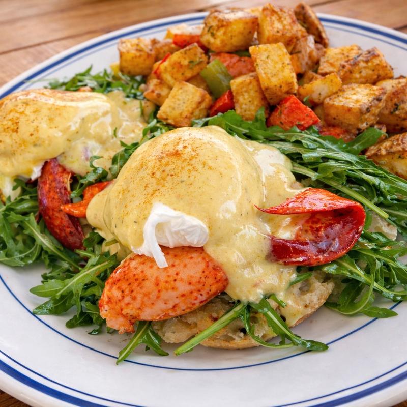 English muffin dressed with arugula and poached lobster topped with hollandaise sauce. Served with breakfast potatoes