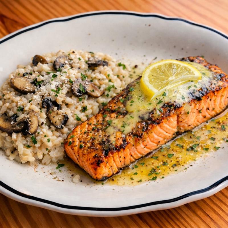 Grilled salmon served on a bed of our creamy mushroom risotto topped with lemon butter.