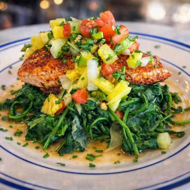 Blackened & served with sauteed spinach & parmesan cheese. Topped with pineapple pico de gallo.