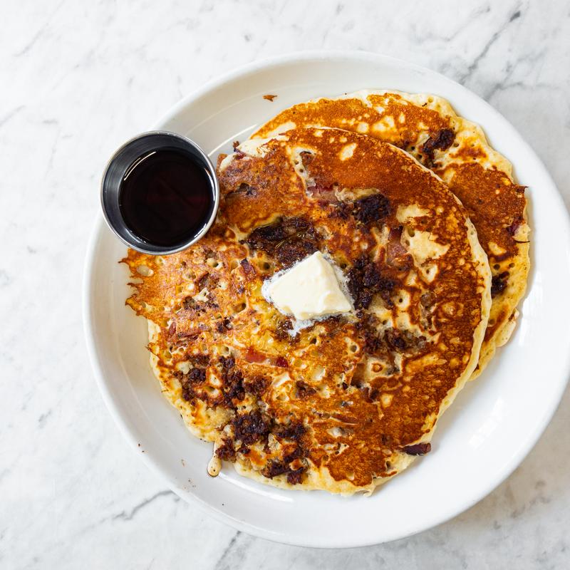 Two of our fluffy sour cream pancakes filled with chocolate chips.