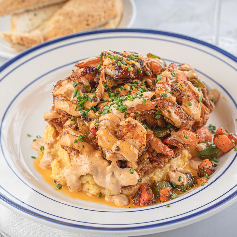 5 large blackened gulf shrimp, trinity vegetables, Anson Mill's andouille cheese grits. Topped with a Cajun cream sauce.