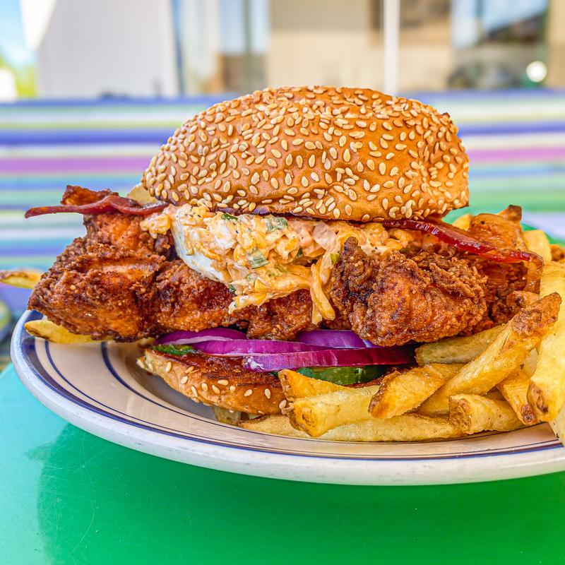 Crispy fried chicken, pimento cheese, bacon, BBQ, pickles & onions