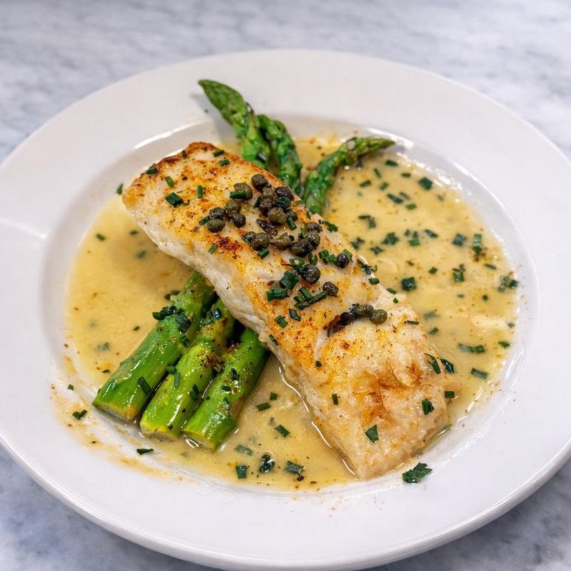 8oz Halibut served with asparagus and topped with capers in a lemon butter wine sauce