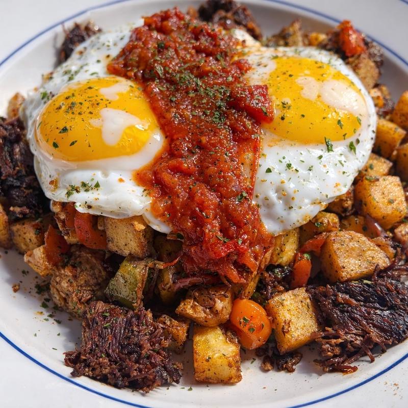 House made breakfast potatoes tossed together with diced peppers & onions topped with braised short rib, two eggs & ranchero sauce.